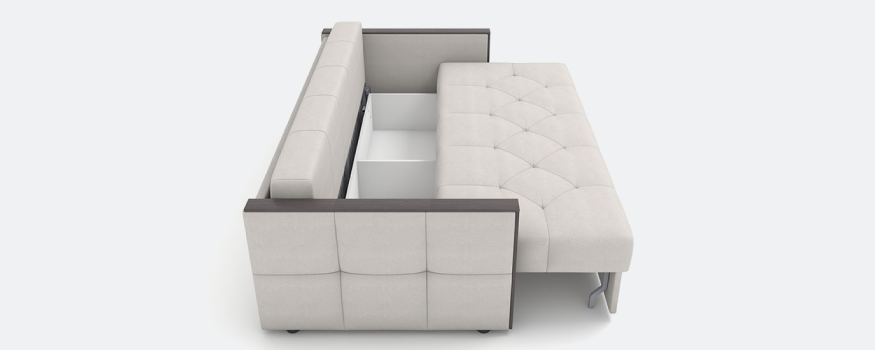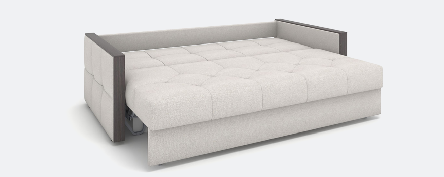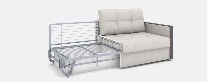 Благодаря металлокаркасу в основании диван легко передвигать, перевозить, собирать и разбирать. При раскладывании механизма получается комфортное двуспальное место с полноценным матрасом, идеально подходящее для ежедневного сна.