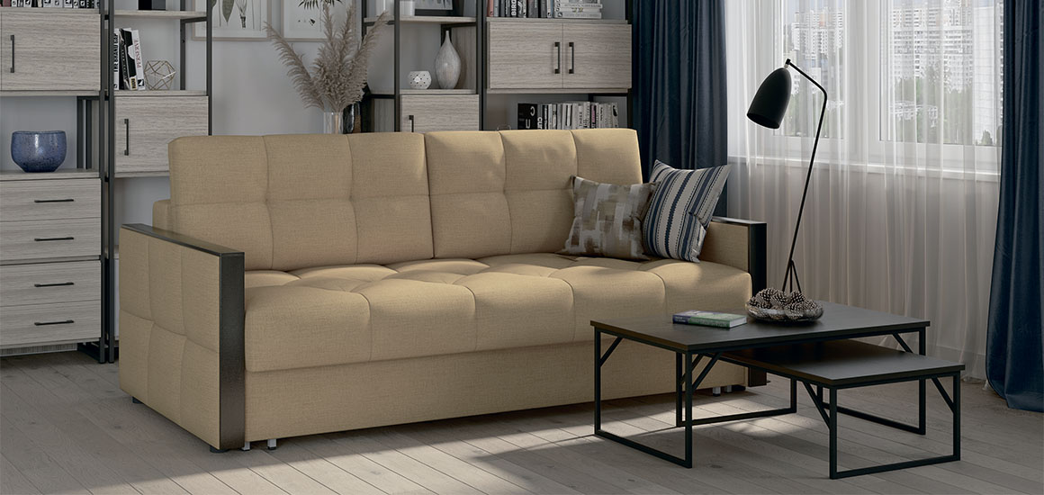 Диван Манхэттен с механизмом трансформации пантограф - это лаконичный дизайн, строгие линии подлокотников, геометрическая стежка чехла.