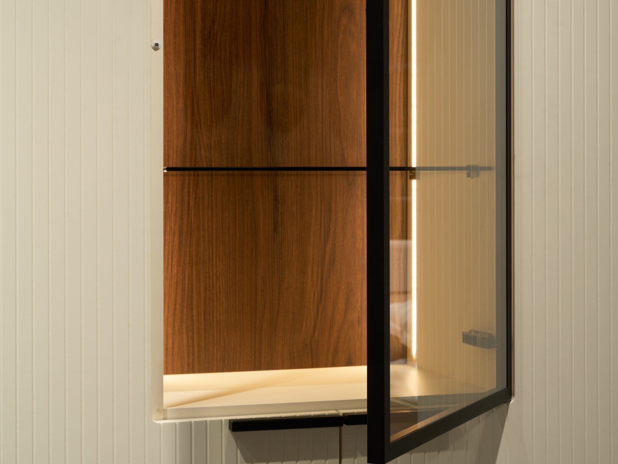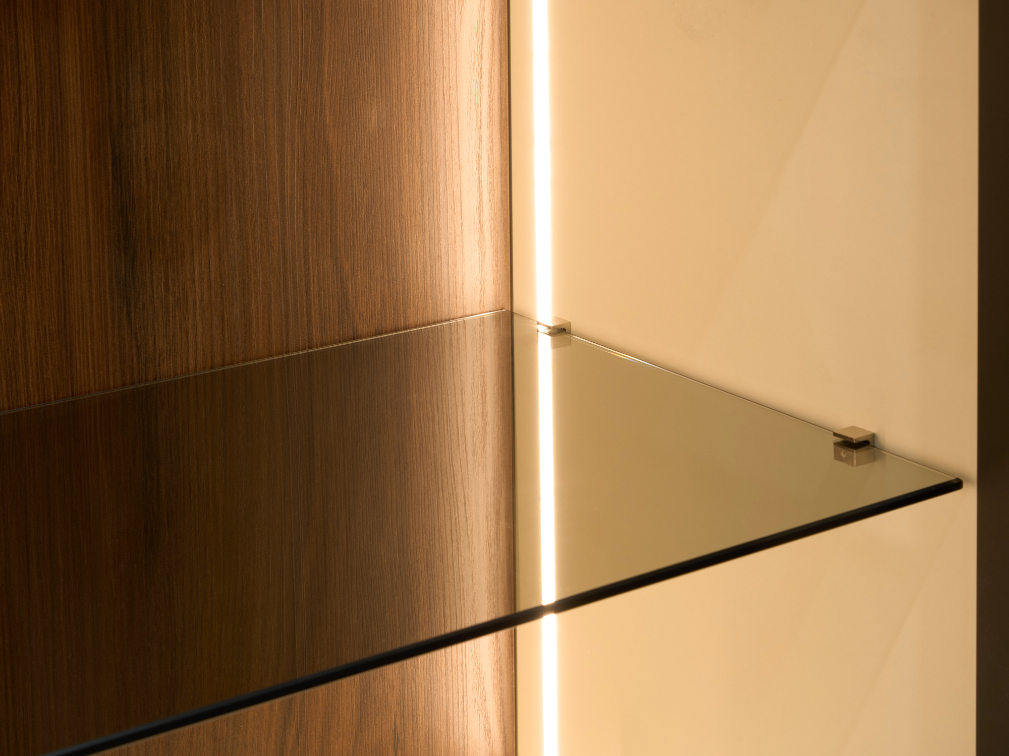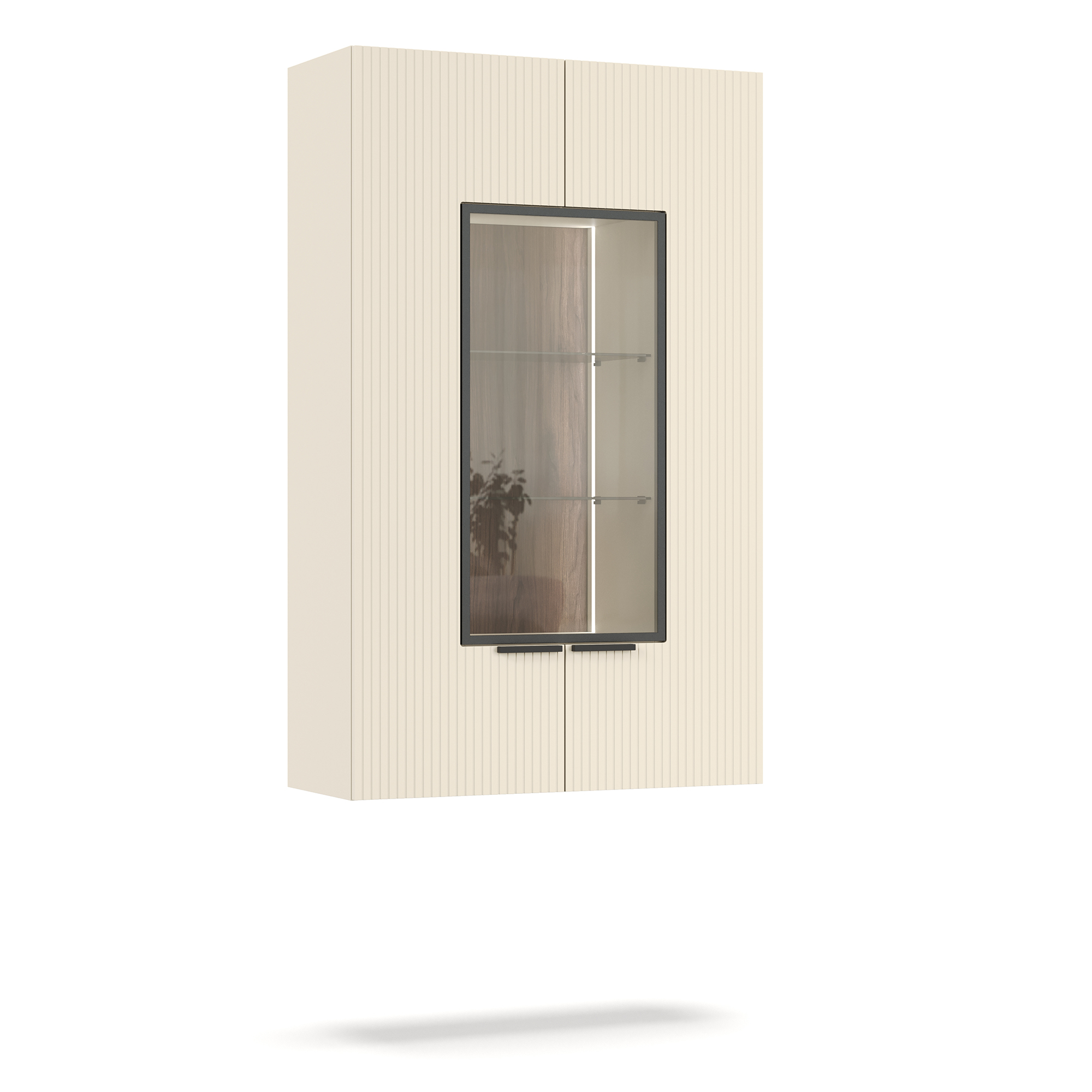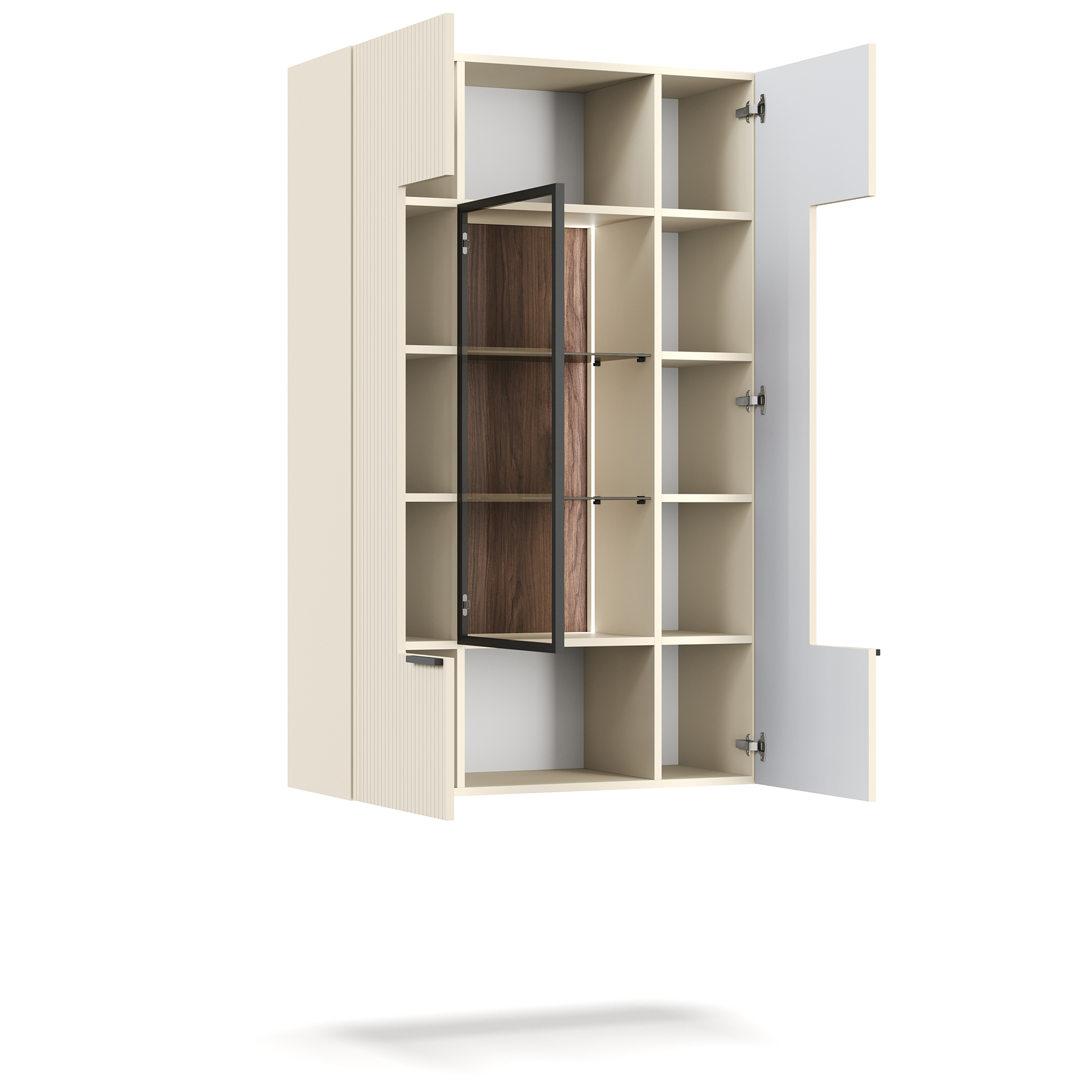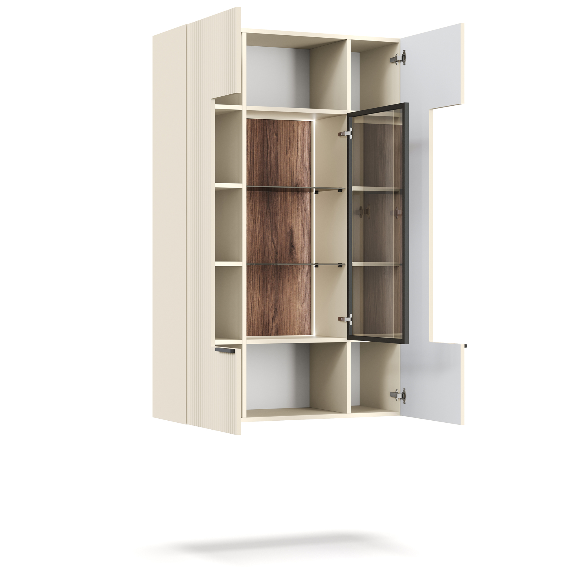 Навесной шкаф NAPOLI оснащен тремя фасадами: одним фасадом из тонированного стекла с зеркальным эффектом и двумя фасадами, декорированными вертикальной фрезеровкой. За глухими фасадами располагаются полки из ЛДСП, за стеклом – система стеклянных полок, а также два врезных светильника (система выключения заказывается отдельно). Для открывания фасада со стеклом используется система Push-to-open. Помимо навешивания на стену, предусмотрена установка шкафа на тумбу. Максимально допустимая распределенная нагрузка на изделие – 30 кг.