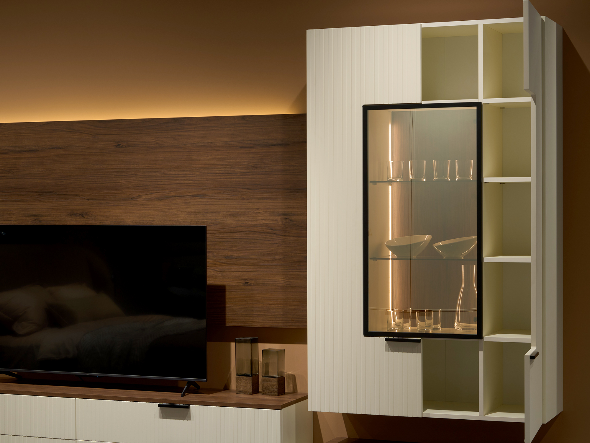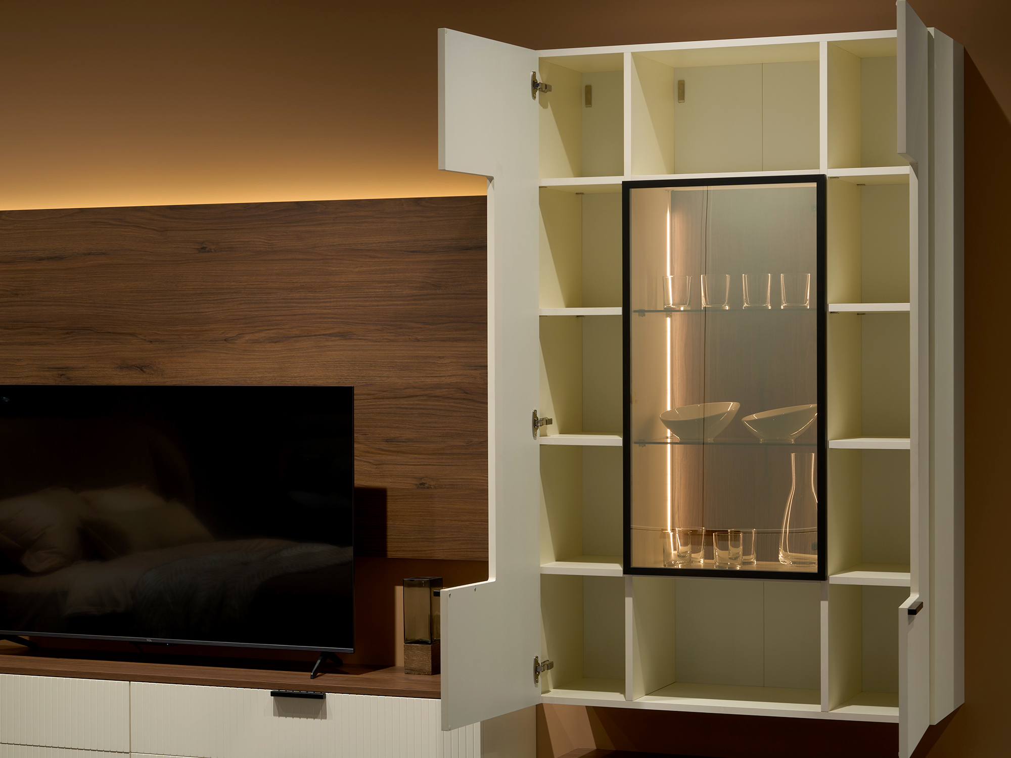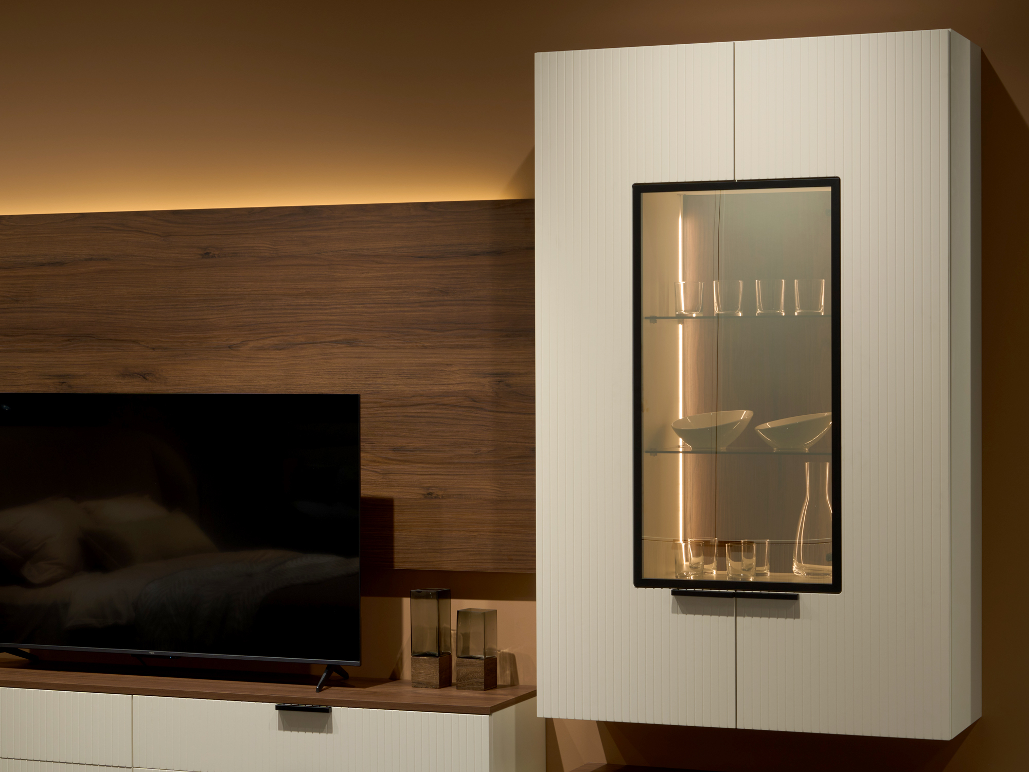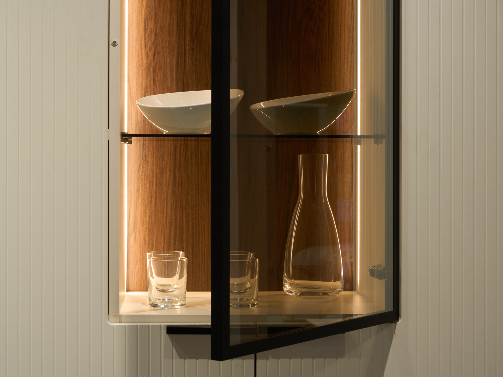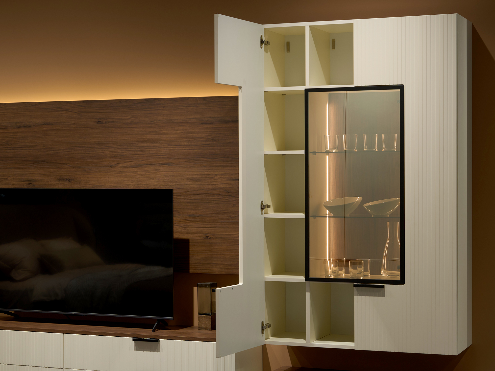 Навесной шкаф NAPOLI оснащен тремя фасадами: одним фасадом из тонированного стекла с зеркальным эффектом и двумя фасадами, декорированными вертикальной фрезеровкой. За глухими фасадами располагаются полки из ЛДСП, за стеклом – система стеклянных полок, а также два врезных светильника (система выключения заказывается отдельно). Для открывания фасада со стеклом используется система Push-to-open. Помимо навешивания на стену, предусмотрена установка шкафа на тумбу. Максимально допустимая распределенная нагрузка на изделие – 30 кг.