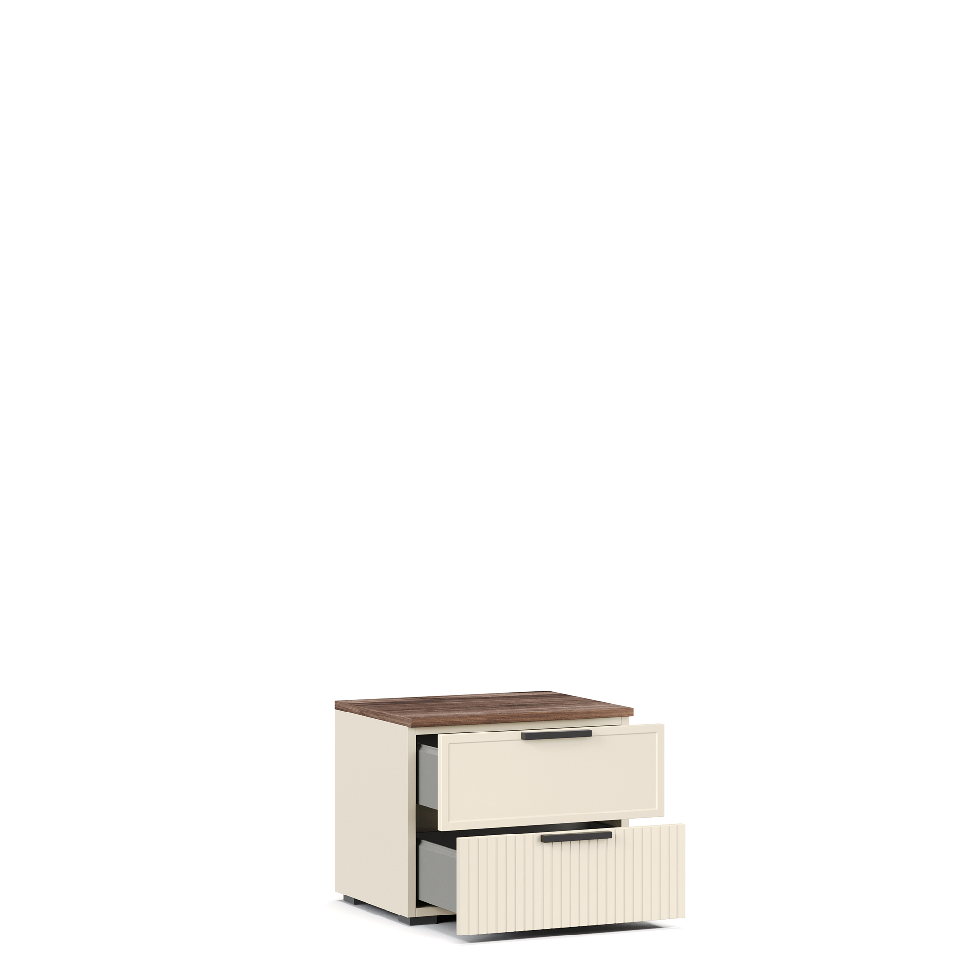 Прикроватная тумба NAPOLI с крышкой в отделке древесной текстурой (входит в комплектацию модели) оснащена двумя выдвижными ящиками. Фасад одного из декорирован тонкой рамкой, второго – вертикальной фрезеровкой. Внутренняя отделка ящиков выполнена в текстуре Шенилл. В качестве опции предлагается установка тумбы на опоры высотой 12 см (заказываются отдельно).