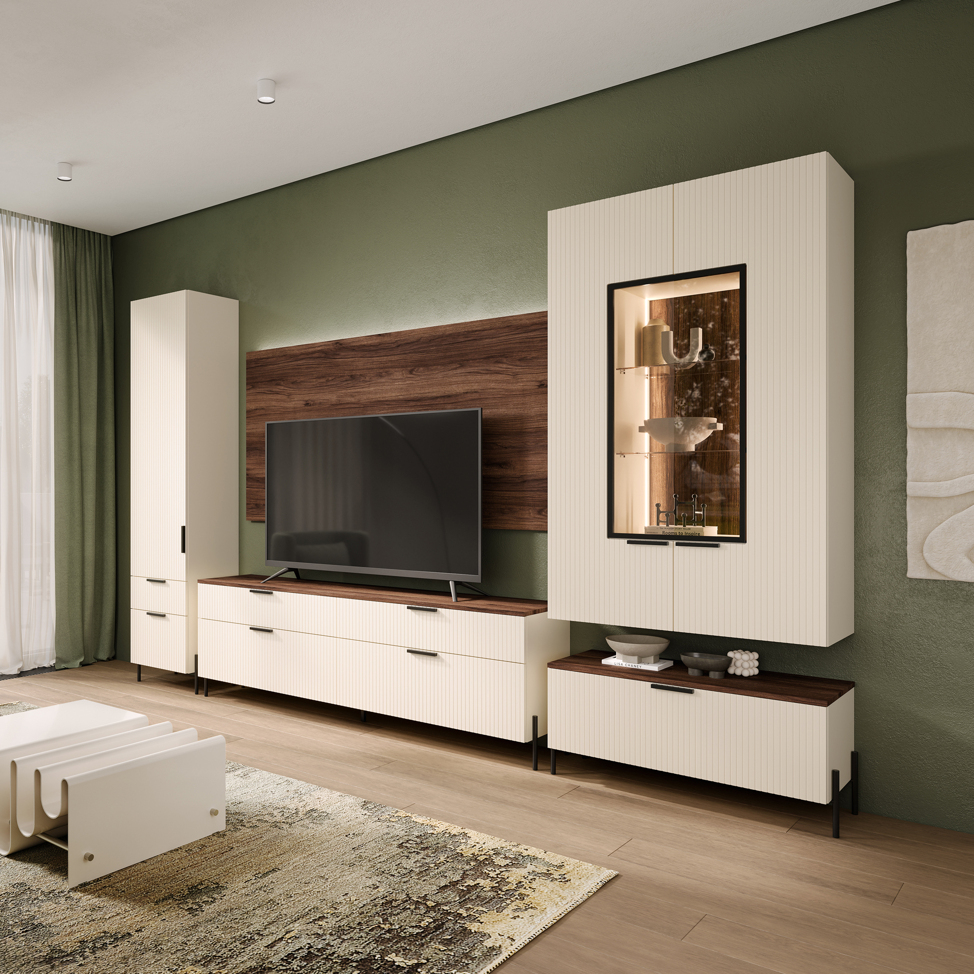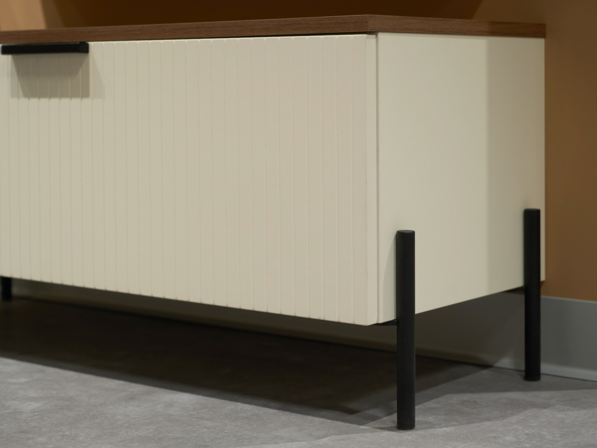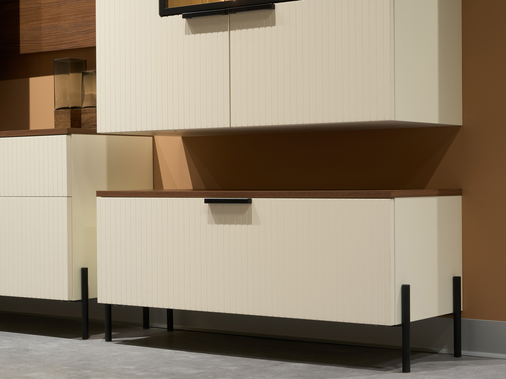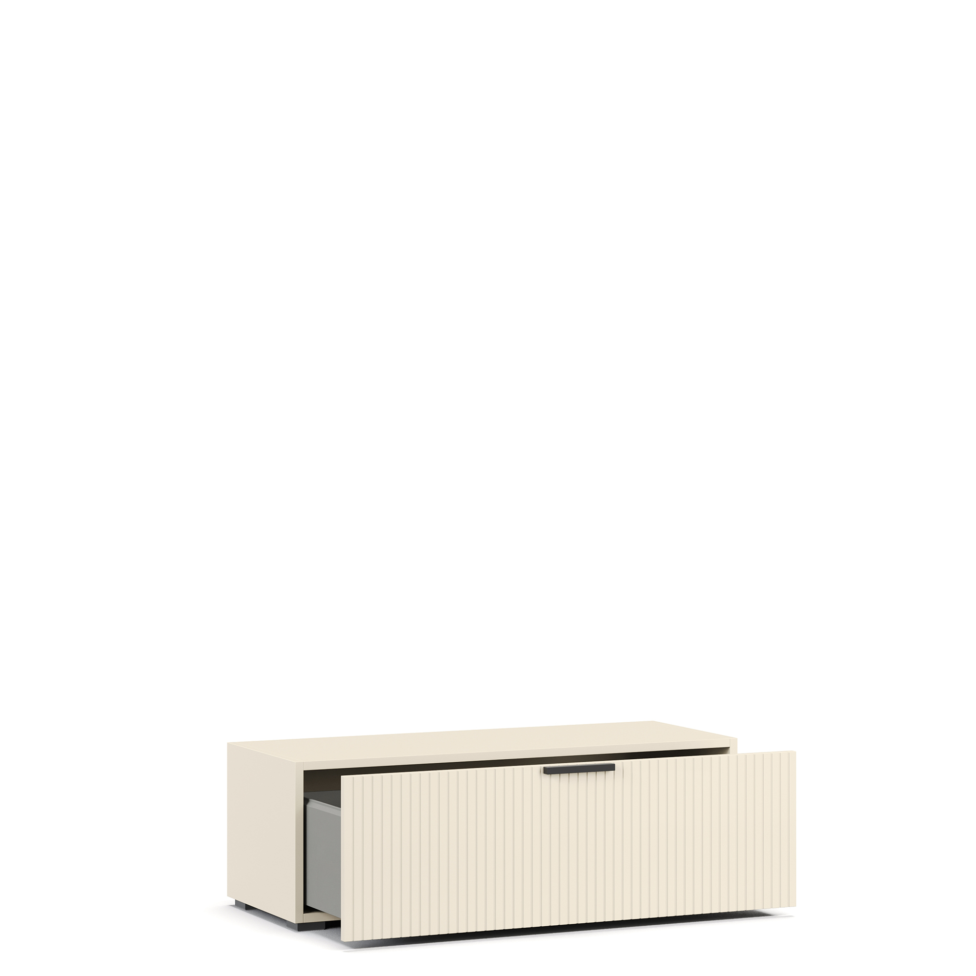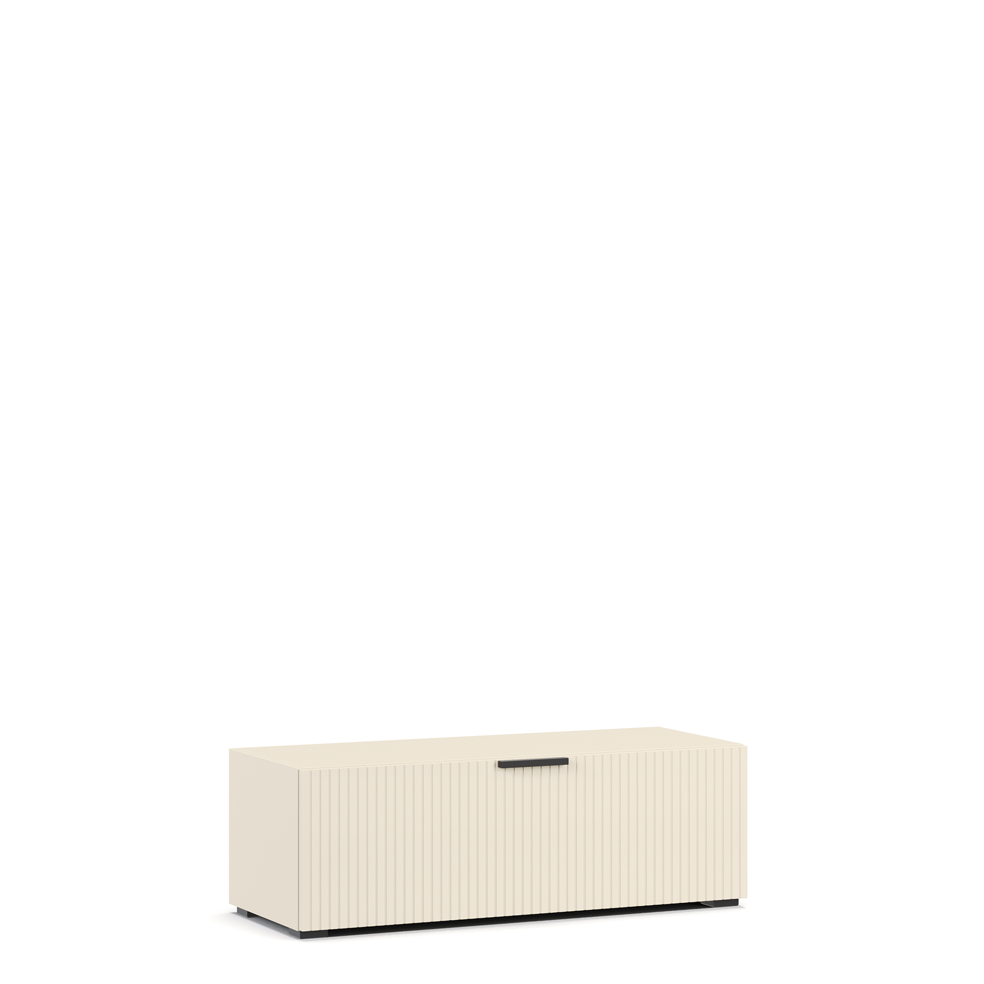 ТВ-тумба NAPOLI с фасадом, декорированным вертикальной фрезеровкой, оснащена одним выдвижным ящиком. В качестве опции предлагается возможность установки тумбы на опоры высотой 12 см (заказываются отдельно). ВАЖНО! Обязателен заказ верхней крышки (использование тумбы без этого элемента дизайном не предусмотрено).