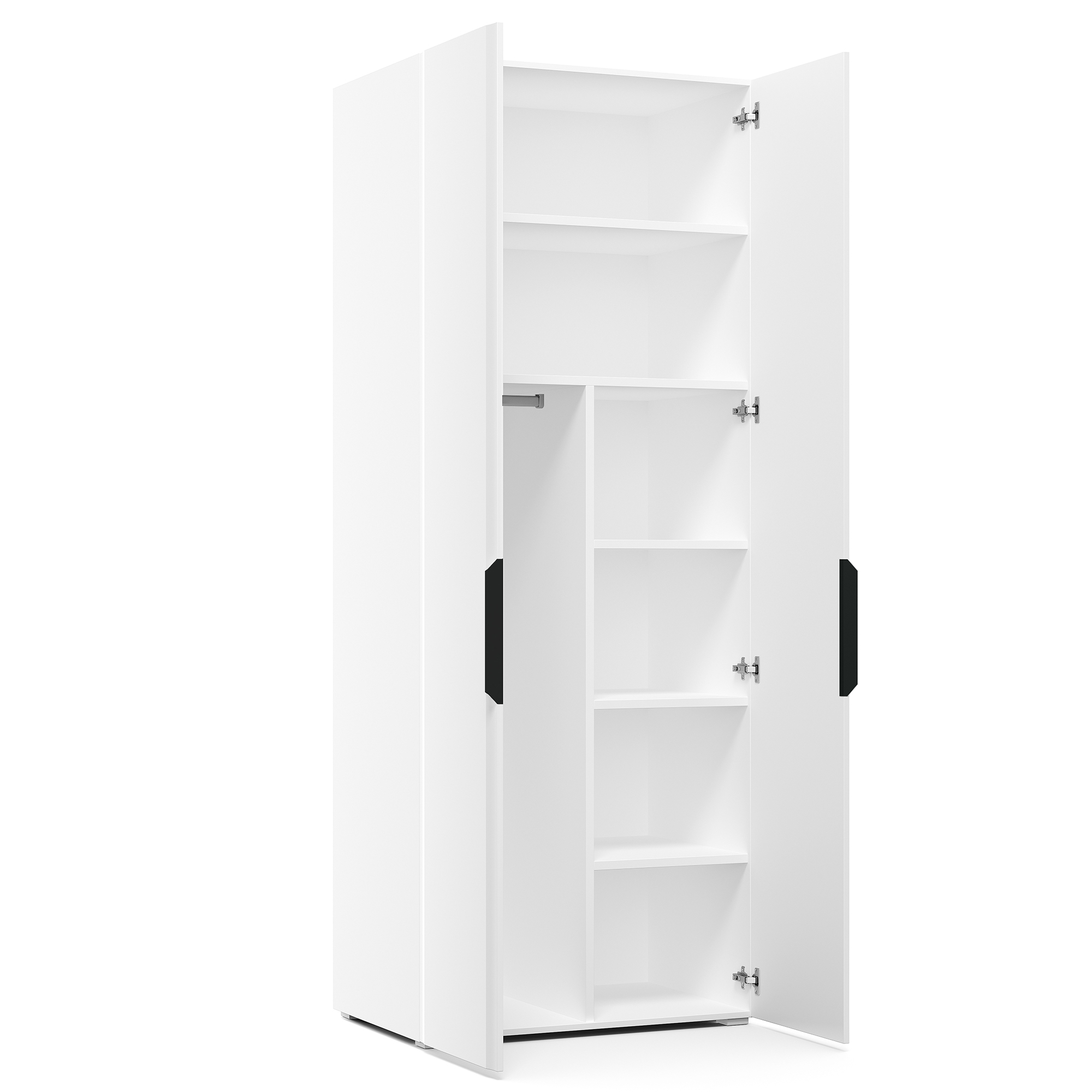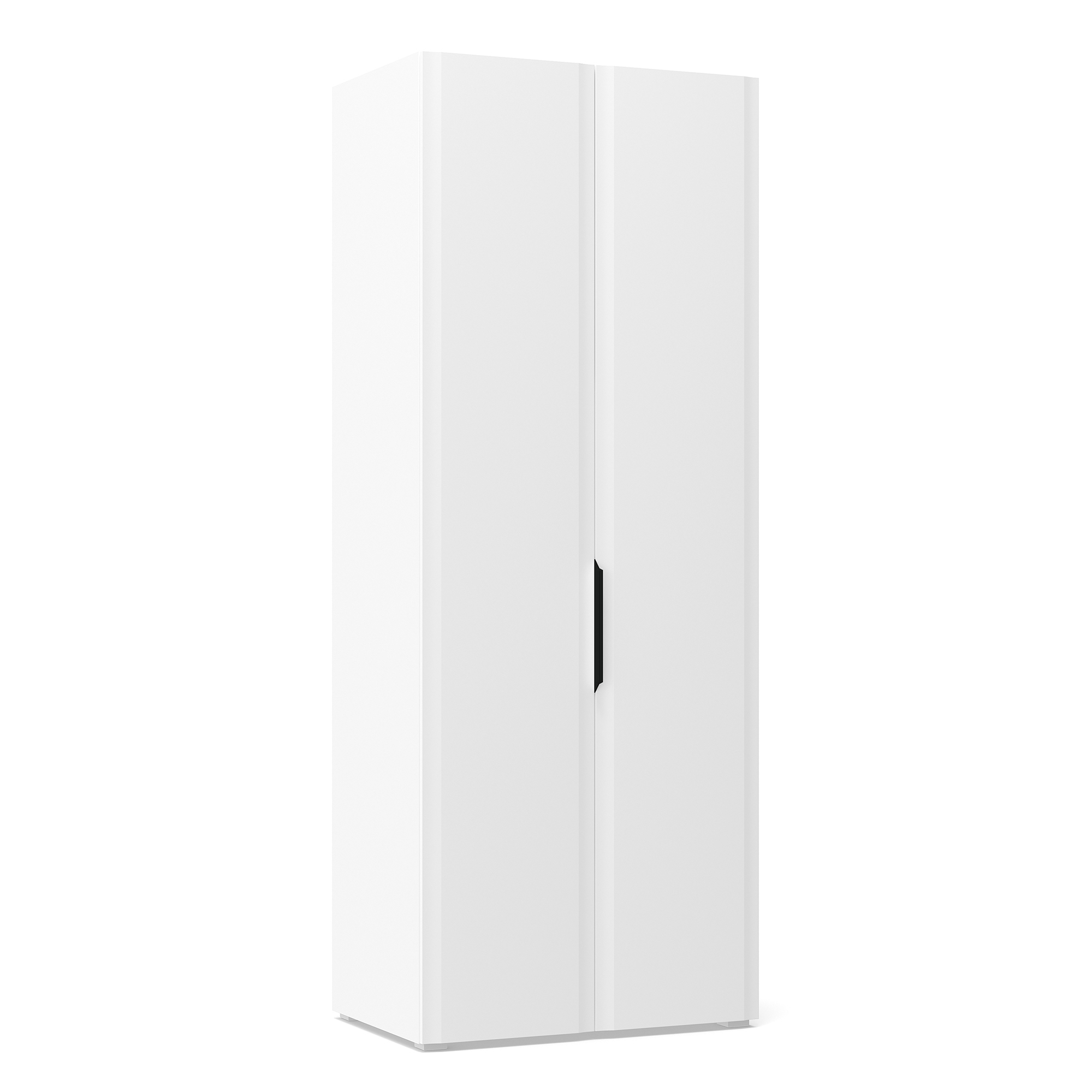Верхняя часть двухдверного шкафа TURIN с фасадами в отделке тактильной шелковой эмалью занята полками. В нижней располагаются штанга для вешалок (крепится снизу к полке) и система полок из ДСП. Ножки входят в комплектацию. Возможно оснащение шкафа системой подсветки,которая включается автоматически при открывании (заказывается отдельно). ВАЖНО: Коллекция предусматривает индивидуальный выбор ручек мебели,благодаря чему можно придать интерьеру стилистический акцент. Они не входят в комплектацию модели и заказываются отдельно.